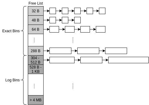 Inspired by dlmalloc, the standard dynamic memory allocator used in the standard GNU library. dlmalloc is a very good example of how a simplistic idea can be generalized to many applications. The main idea of dlmalloc is the Segregated Free List, which is used to achieve high performance - amortized O(1) allocation and free - while maintaining low fragmentation and high peak memory utilization. This allocator is optimized for specific workloads using various techniques such as: