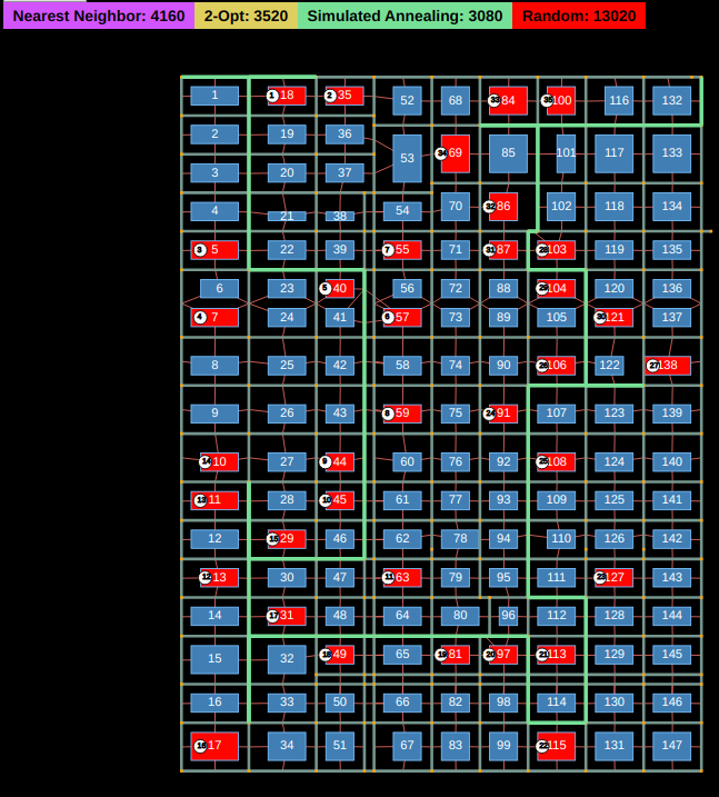 To benchmark performance of 2-opt and SA implementations, an approximated Held-Karp algorithm (which yields a lower-bound distance on the optimal TSP solution) was implemented. The algorithm was implemented using the top-down dynamic programming approach.