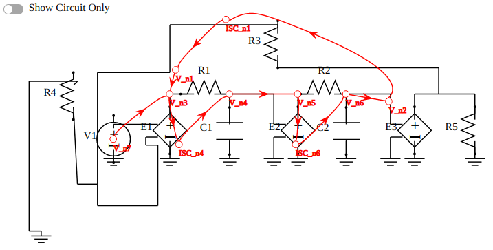The function of the Circuit Schematic Visualizer is to render each circuit component at predefined positions and orientations. Separate sub-modules were created for each unique component including: resistor, capacitor, dependent/independent voltage & current sources, wires, and ground nodes. The SFG Overlay solves the curve-generation problem by employing a heuristical variation of Bézier curves, a polynomial interpolation technique where a curve is procedurally generated based on a set of predefined control points. |
